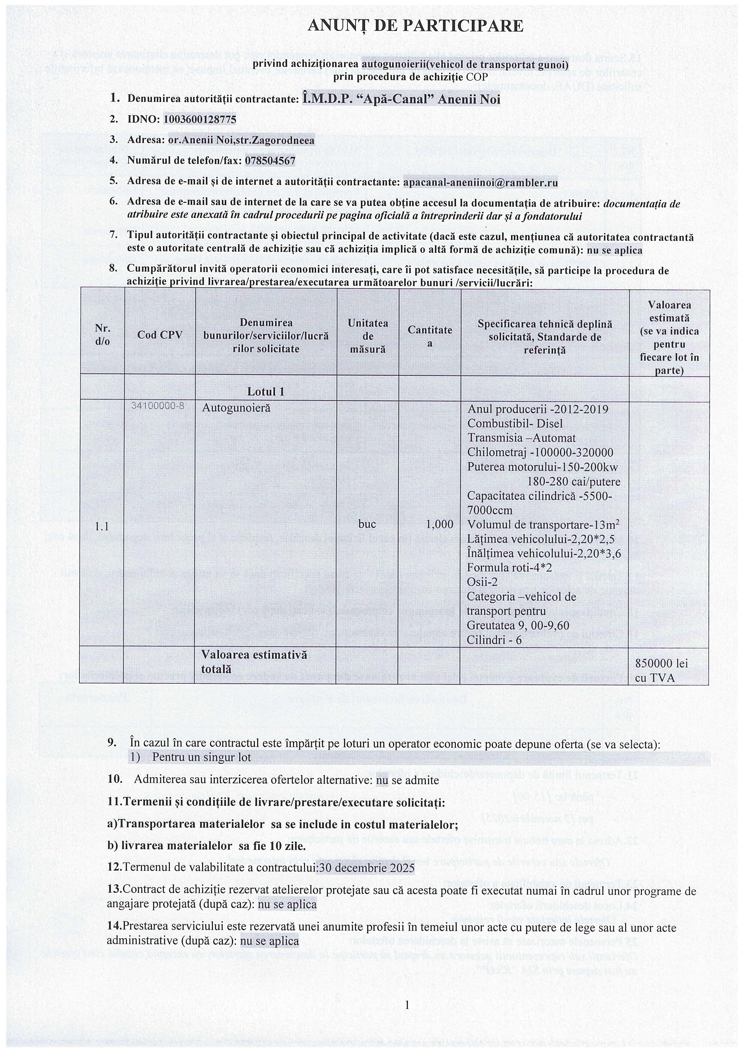 Întreprinderea Municipală Direcția Producție “Apă-Canal” Abebii Noi, cu sediul în or. Anenii Noi , str. Zagorodneia, nr. 9, intenționează să procure o autospecială destinată colectării și evacuării deșeurilor menajere, în scopul îmbunătățirii serviciilor de salubrizare prestate pe raza localității.